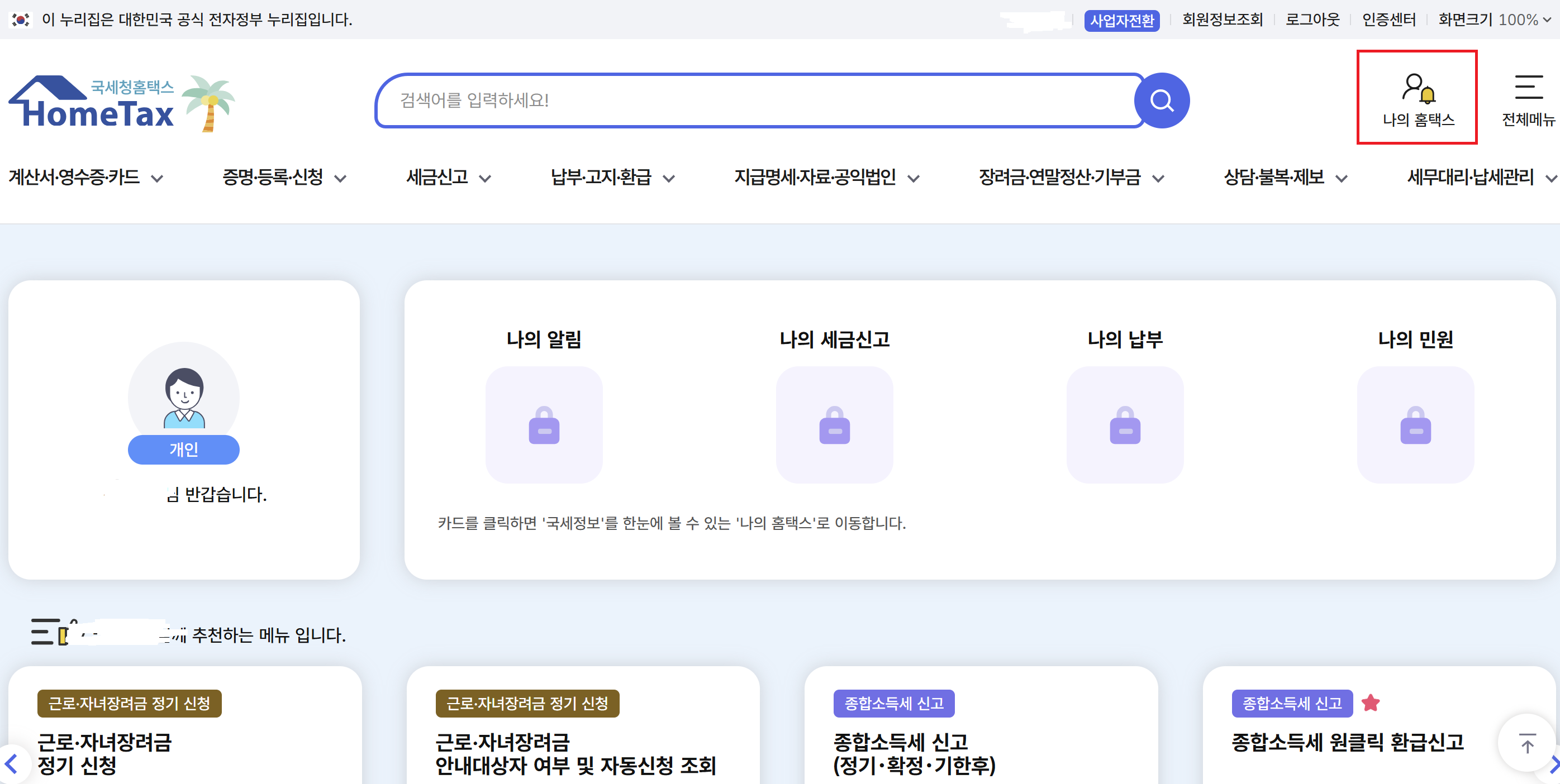- 로그인 후 상단 메뉴에서 [나의홈택스] > [나의,소득연말정산] 클릭