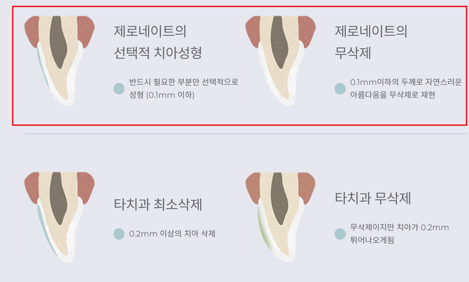 제로네이트는, 기존의 라미네이트 시술과 비슷해 보이지만, 최소한의 치아삭제만을 통해 심미적으로 우수한 효과를 낼 수 있는 시술이라고 합니다. 제로네이트의 코팅막 재질은 0.01mm로 콘택트렌즈보다 얇게 제작 가능한 스위스 기술을 기반으로 탄생하게 되었다고 합니다.