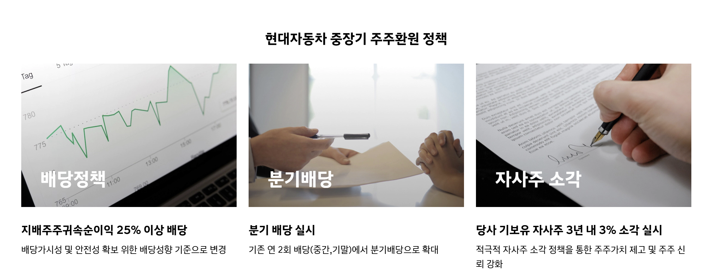 아래는 현대자동차 홈페이지에 공개된 주주환원 관련 자료입니다. 이렇게 투명한 기업에 투자한다는 것은 굉장히 투자자 입장에서 매력적으로 느껴질 수밖에 없습니다.