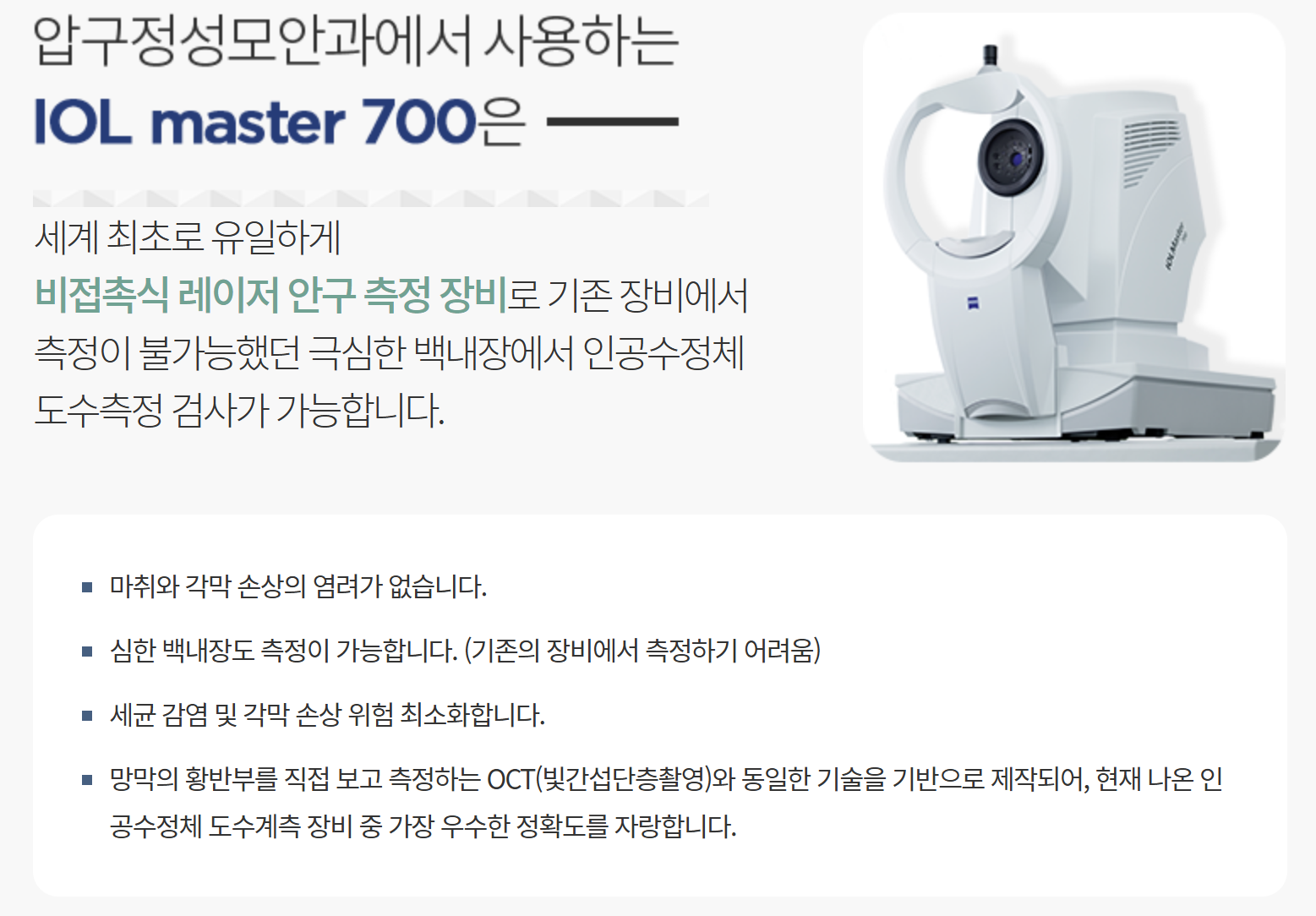 - 비접촉형 인공렌즈 도수 측정기인 IOL master(독일Zeiss)와 접촉형 측정기(미국Alcon) 등 최첨단 장비를 사용하여
