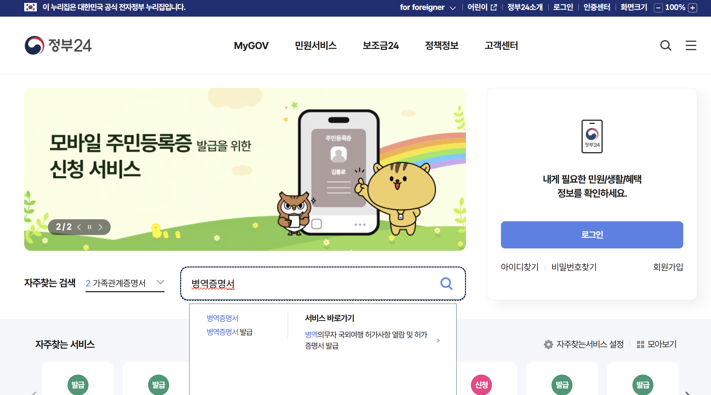 모바일 앱에서 정부24를 다운로드하여 접속하셔도 됩니다.