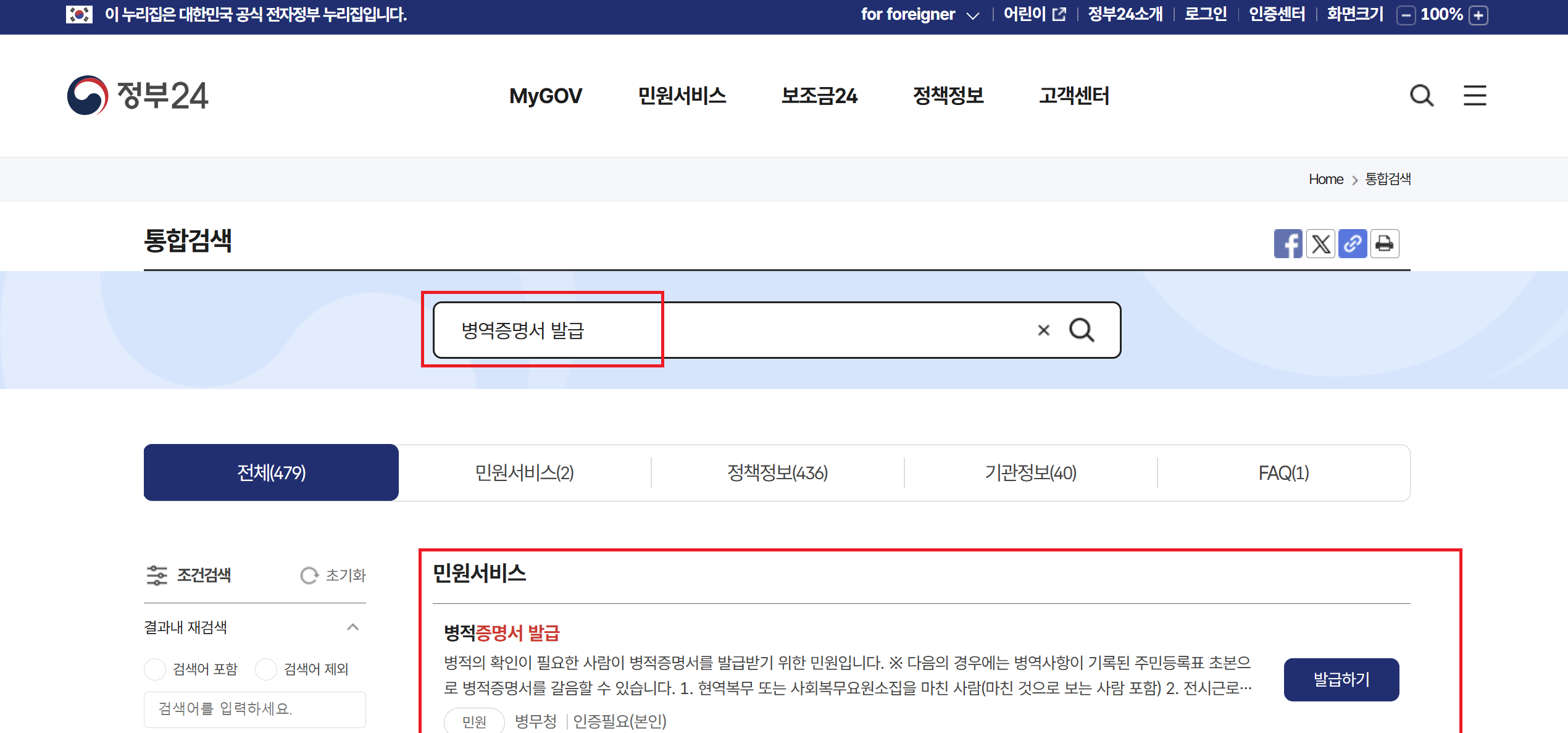 정부24사이트가 열리면 검색창에 '병역증명서' 키워드를 검색하시면 바로 병역증명서 발급이란 키워드가 자동완성으로 보이실 겁니다. 해당 자동완성 키워드인 '병역증명서 발급' 키워드를 클릭합니다. 병역증명서와 병적증명서 같은 말이니 헷갈리지 않으셔도 됩니다.^^