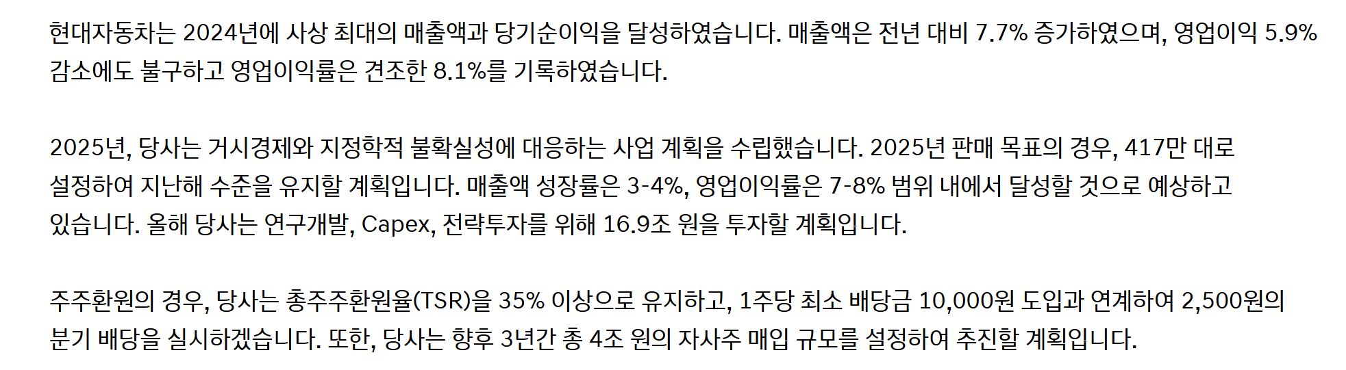 중장기적으로 현대자동차의 사업 전망이 밝다는 점을 고려할 때, 배당 수익과 자본 이득을 모두 노릴 수 있는 균형 잡힌 투자 전략이 가능합니다.